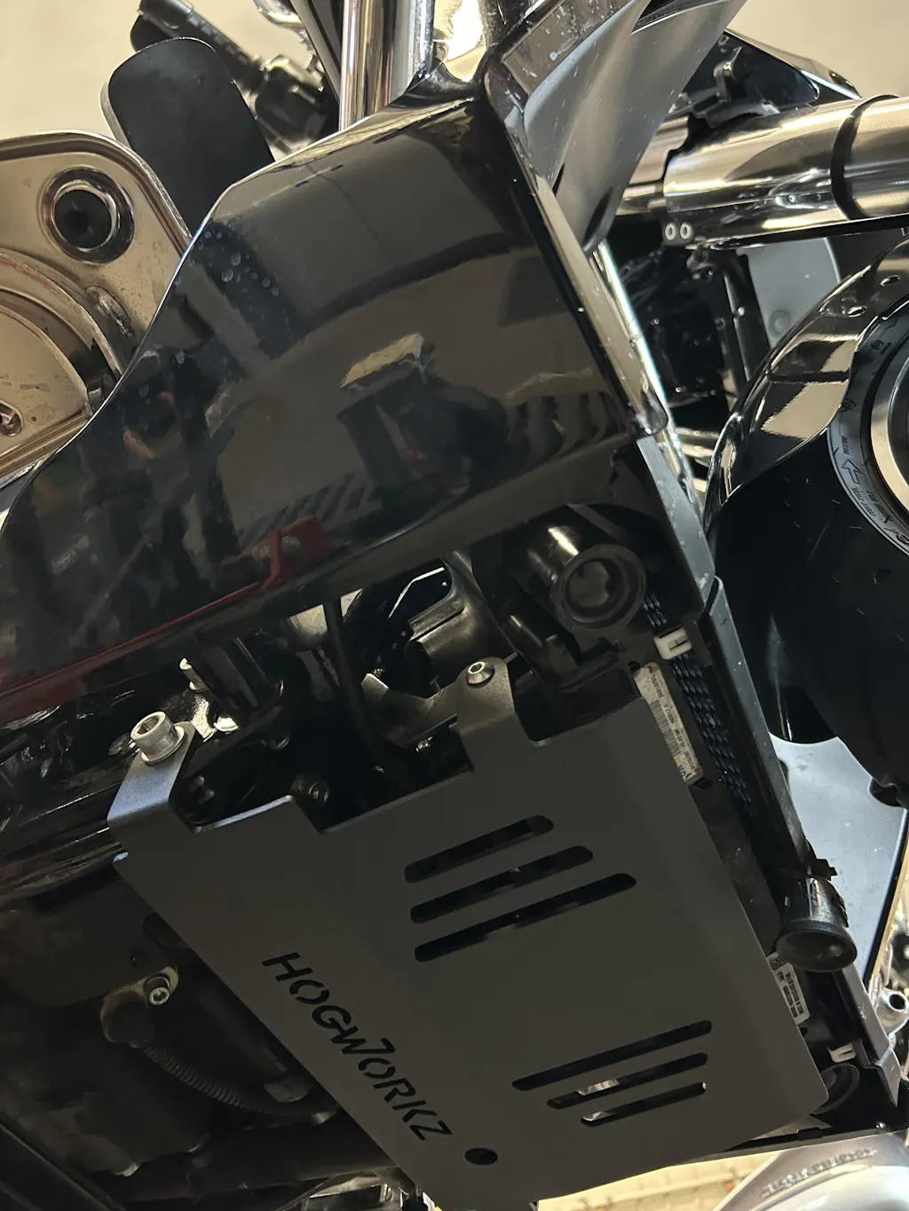 Hit the road with confidence using HOGWORKZ® Skid Plates for '24 and up Harley-Davidson Touring models with the new fairing desgin. These tough plates guard the vulnerable water line and wiring tucked between your frame and radiator, keeping you rolling smoothly without the worry of breakdowns miles from help. Crafted from durable 5052 aluminum, you can choose between a sleek raw finish or a sleek powder-coated black. With a solid 0.125" thickness, these plates are built to last. Plus, installation is a breeze with your existing factory hardware. Ride free and stay protected on your next adventure!