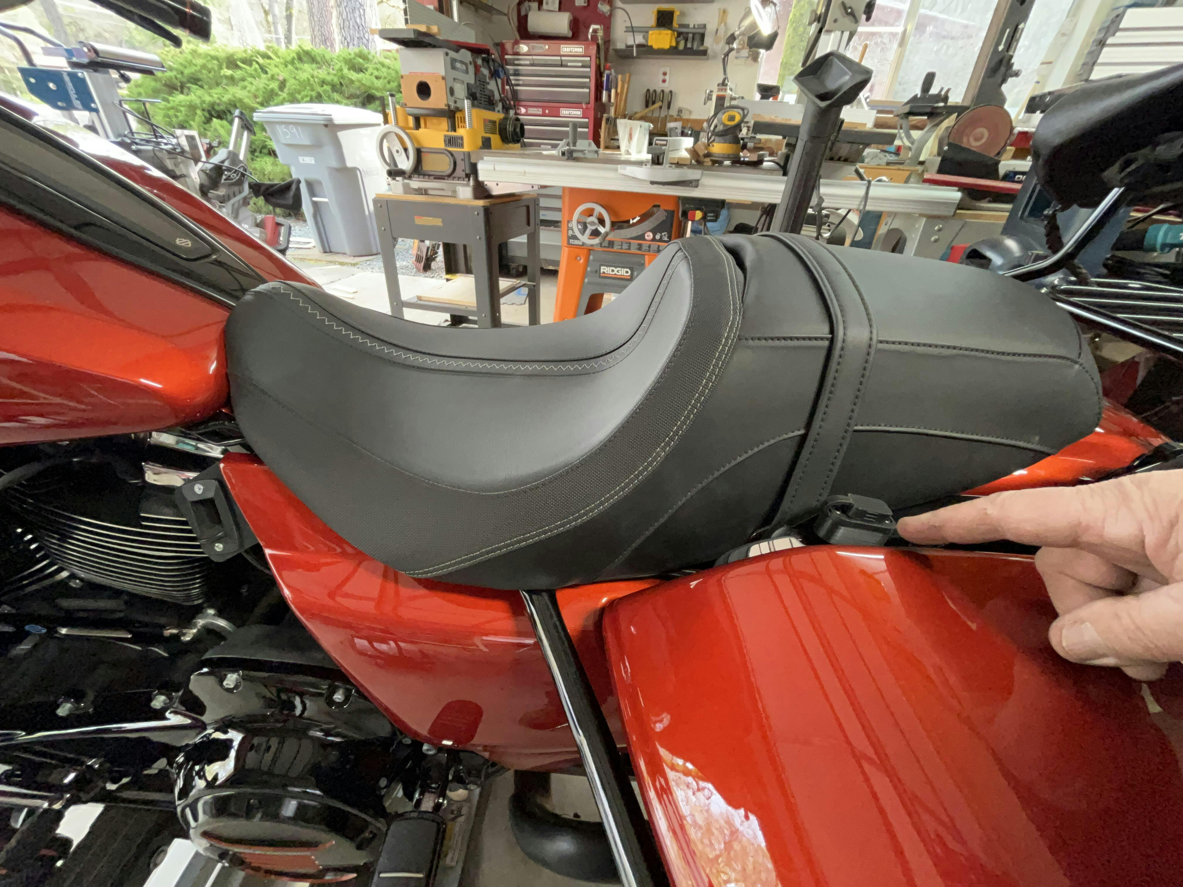 • Mounts on left side at front of seat below rear of fuel tank (easiest access for plugging in heated gear)